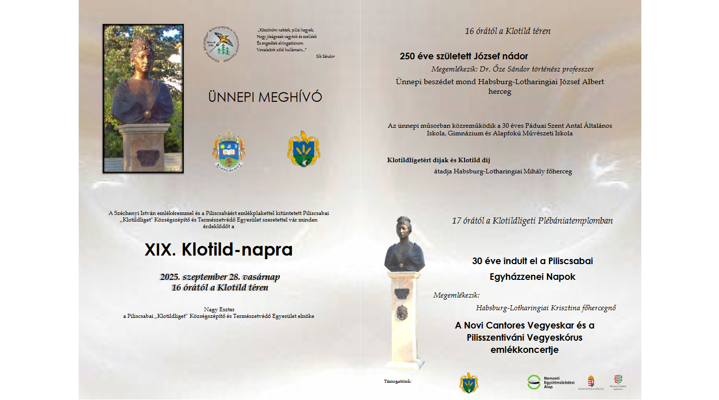 A Széchenyi István emlékéremmel és a Piliscsabáért emlékplakettel kitüntetett Piliscsabai „Klotildliget" Községszépítő és Természetvédő Egyesület szeretettel vár minden érdeklődőt a XIX. Klotild-napra.
